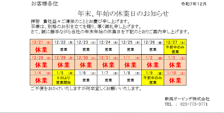 年末年始休業期間の受入休止日につきまして、以下のようにお知らせいたします。